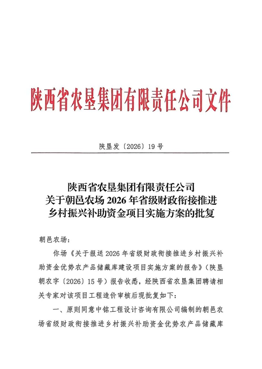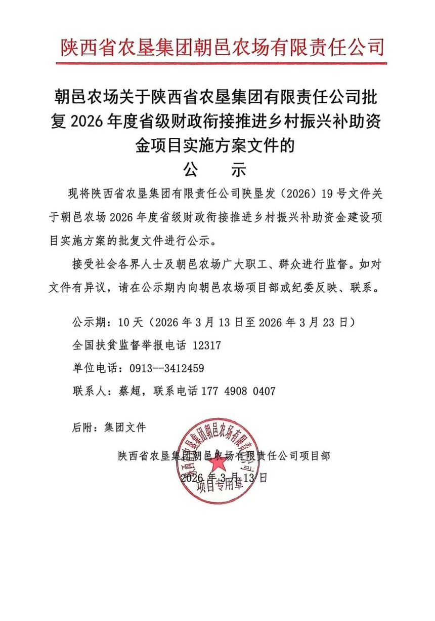 朝邑農(nóng)場(chǎng)關(guān)于陜西省農(nóng)墾集團(tuán)有限責(zé)任公司批復(fù)2026年度省級(jí)財(cái)政銜接推進(jìn)鄉(xiāng)村振興補(bǔ)助資金項(xiàng)目實(shí)施方案文件的公示时间:2026-03-13 【原创】 阅读